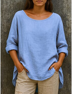 Naisten pellavan kaltainen tekokuituinen liinakangas paidat rypytetty yksi värinen perus rento pitkät hihat pyöreä pääntie säännölliset yläosat päivittäinen vaaleanpunainen taivaansininen vihreä