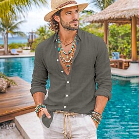 Miesten Paita Pellava paita Kesä paita Ranta-asut Tavallinen Loma Kausaliteetti Musta Valkoinen Apila Khaki Pitkähihainen Kauluskäänne Kesä Kevät kesä Vaatetus