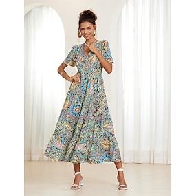 naisten midi boho mekko v-pääntie lyhythihainen paisley print levenevä kesä rento kevyt hengittävä kangas värikäs boheemi tyyli lomarantaasut monivärinen saatavana useissa koossa