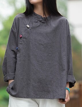 Naisten pellavamainen keinokuitupusero napilla yksivärinen elegantti päivittäinen tyylikäs pitkähihaisella kauluksessa pitkät yläosat päivittäinen ulosmenoon musta valkoinen viininpunainen