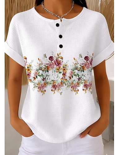 Naisten Waffle Rakennettu Neule Paidan T-paita Väri Blokki Grafiikka Geometria Kasvit Tyylikäs Klassinen Lyhythihainen Pyöreä kaula Päivittäinen Urheilu Viikonloppu Musta ja Valkoinen Valkoinen