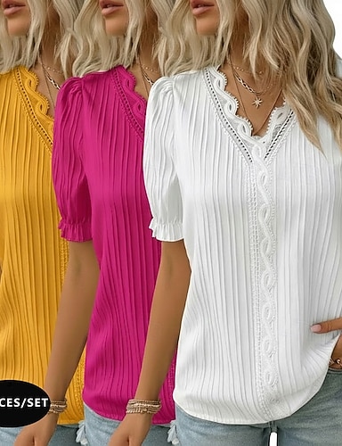 naisten 3 kpl:n pakkauksessa teksturoidtu pusero t-paita pitsi tilkkutäkki yksivärinen muoti tyylikäs klassinen lyhythihainen v-aukkoinen normaali toppi rento päivittäin ranta valkoinen+fuksia+keltainen