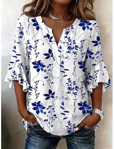 Naisten Pusero Röyhelö Painettu Kukka Kuvitettu Loma Päivittäin Retro / vintage 3/4 hiha V kaula-aukko Pitkät topit Kausaliteetti Päivittäin Pyhäpäivä Sininen Rubiini Purppura Apila Kesä Kevät
