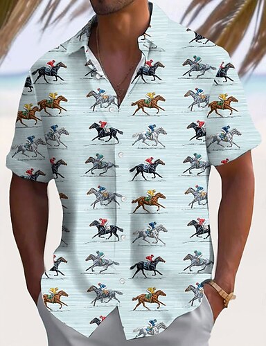 Kentucky Derby Miesten Raidoitettu Kilparatsastus Paita Kesä paita Button Up paita Lyhythihainen Vintage retro Pyhäpäivä Kesä Kevät Sänkyjen avaus 3D-tulostus kauluspaidat Sininen Valkoinen Apila