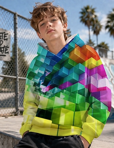 Poikien 3D Kuvitettu Geometrinen Huppari Pullover Pitkähihainen 3D-tulostus Kesä Kevät Urheilu Muoti Katutyyli Lapset 4-12 vuotta Hupullinen Kausaliteetti Päivittäin ulko- Normaali
