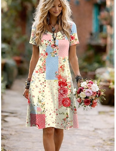 Naisten maksimmekko t-paitamekko tee-mekko auringonpaiste shift-mekko boheemi etninen loma syntymäpäivä loma säännöllinen istuvuus vintage lyhyt hiha pyöreä kaula-aukko punainen sininen vihreä