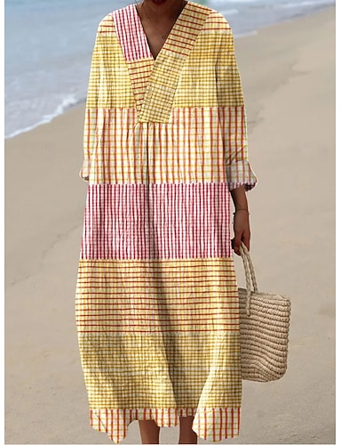 Naisten maksimekko pellavankaltaista hengittävää kevyttä kaftaania 3/4 pituisilla hihoilla pyöreä pääntie rentoa suoremekkoa boho päivittäin lomapäiväksi graafista geometriaa keltainen sininen