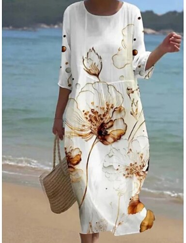 Naisten Midimekko Rento mekko Painatus mekko Muoti Moderni Päivittäin Hiekkaranta Viikonloppu Normaali Kukka 3/4 hiha Tiukka pyöreä kaula-aukko Valkoinen Fuksia Khaki Aprikoosi Kevät Syksy