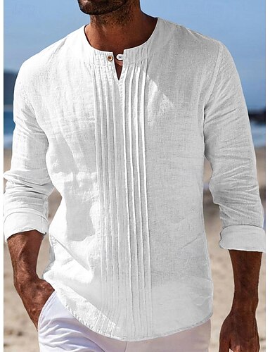 Miesten Paita Pellava paita Kesä paita Rantapaita Yhtenäinen väri Kausaliteetti Loma Sininen Musta Valkoinen Khaki Pitkähihainen Pystykaulus Kesä Kevät Vaatetus Rypytetty