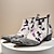 Miesten valkoiset ja mustat kukkakuvioiset aidosta nahasta valmistetut saappaat käärmekuvioisilla yksityiskohdilla – muodikkaat jalkineet rentoon arkeen ja erityistilaisuuksiin