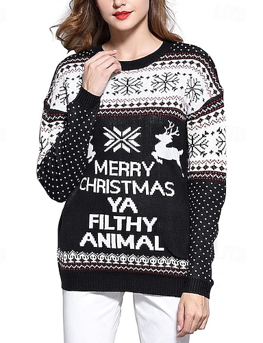 Naisten jouluneule Fair Isle -neulepusero Vapaa-aika Lumihiutalekuvioinen Joustinneule Pyöreä kaula-aukko Neulepainatus Pitkähihainen Normaali Topit Neuloa Joulu Päivittäin Pyhäpäivä Musta Valkoinen Talvi