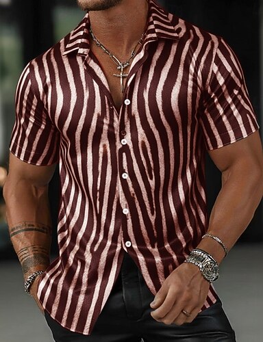 Miesten Geometrinen Raidoitettu Seeprapainatus Paita Kesä paita Button Up paita Lyhythihainen Muoti rento Päivittäin Toimisto Loma Kesä Kevät Sänkyjen avaus 3D-tulostus kauluspaidat Musta Rubiini