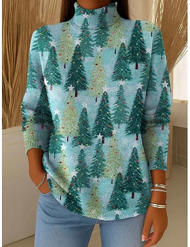 Naisten Neulos Vintage Vapaa-aika Pehmeä Kuvitettu Joulukuusi Joustin Poolokaulus Kudottu Painettu Pitkähihainen Tavalliset topit Neuloa ulko- Päivittäin Viikonloppu Vaalean vihreä Sininen Syksy Talvi