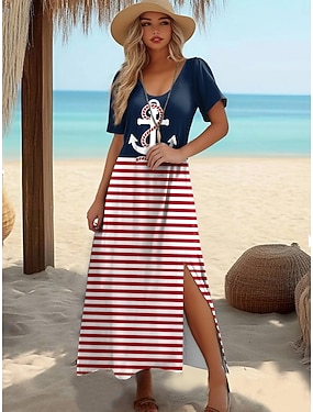 itsenäisyyspäivän patrioottinen naisten maksimekko A-linjainen mekko liukoväri lomat rento boho ranta muotoon istuva graafinen lippu vintage hihaton V-kaula-aukko tummansininen kesä kevät
