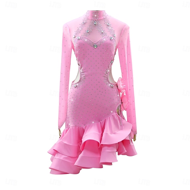 latinalainen salsatanssipuku kristallilla / strassilla koristeltu naisten juhlaesitys pitkähihainen rumba chacha -lavakilpailuasu #10188149