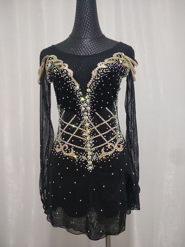 Taitoluistelupuku Naisten Tyttöjen Luistimet Hameet Musta Tilkkutäkki Avoin selkä Silmukka Erittäin elastinen Kouluts Kilpailu Luisteluasu Klassinen Kristalli / Strassi Pitkähihainen Luistelu