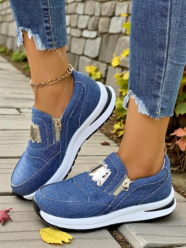 Naisten farkkuslip-on-lenkkarit kultaisilla yksityiskohdilla – kevyet rennot kävelykengät sivuvetoketjulla shoppailuun, kaupunkimatkoille ja viikonloppumatkoille #13557742