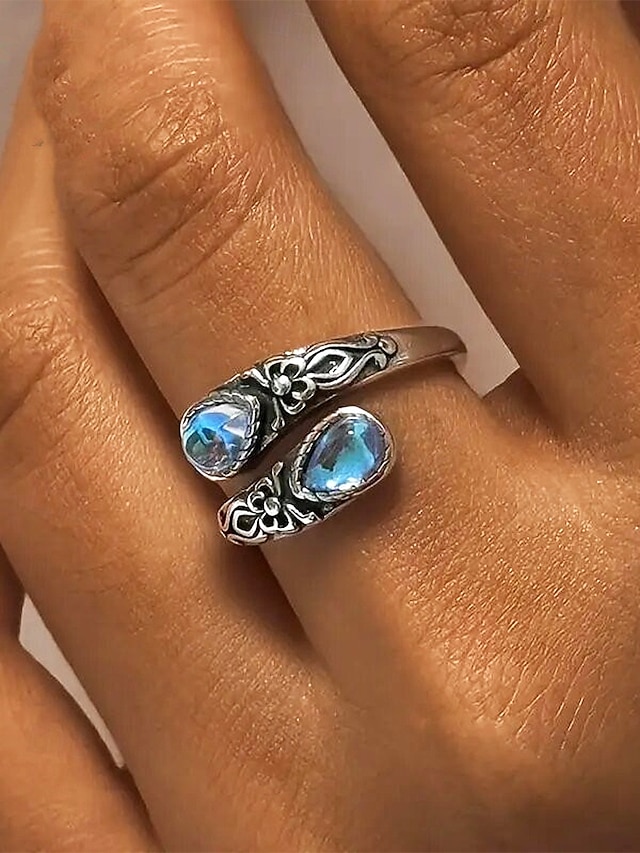 Naisten hopeinen säädettävä sormus kuukivellä ja kristallilla, vintage-boheemi koru kihlaukseen, vuosipäivään ja arkeen#13931140