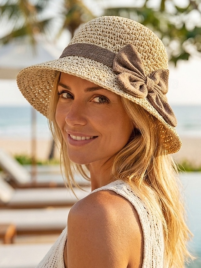 Naisten boheemi olkihattu rusetilla – useita värejä, kokoontaitettava helppoa kantamista varten, täydellinen arkeen ja rantalomalle #15247790