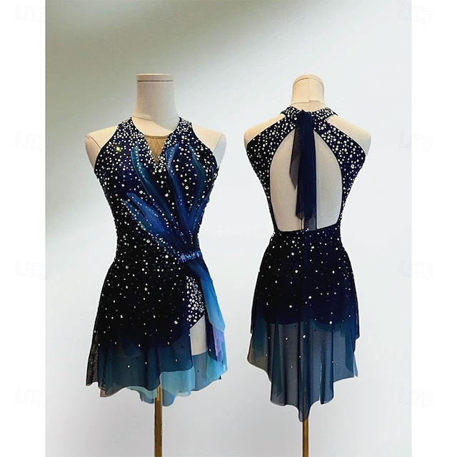 Taitoluistelupuku Naisten Tyttöjen Luistimet Hameet Musta / Sininen Tilkkutäkki Avoin selkä Spandex Silmukka Erittäin elastinen Kouluts Kilpailu Luisteluasu Klassinen Kristalli / Strassi Hihaton #16070175