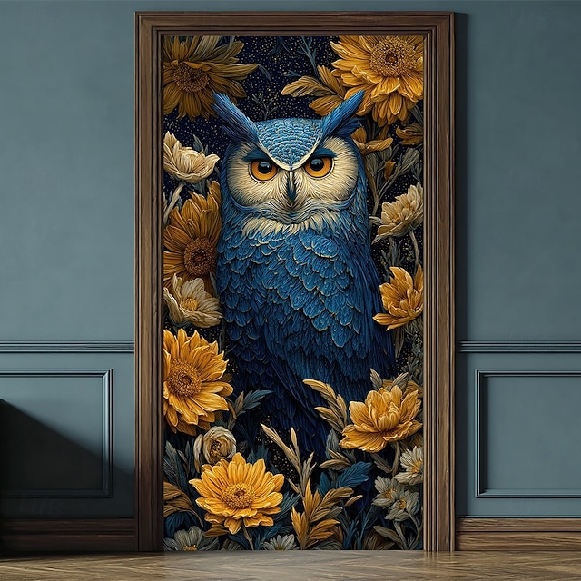 sininen pöllö keltaisilla auringonkukilla keskiyön kukkataide tähtitaivas ovibanneri seinävaate autotallin oven banneri kodin sisustus etuoven koristelu eteisen sisustus sisällä ja ulkona#16540825