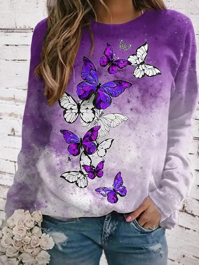 Naisten Puserot Painettu Kuvitettu Perhonen Vapaa-aika Pitkähihainen Tiukka pyöreä kaula-aukko Pyöreä kaula-aukko Tavalliset topit Kausaliteetti Katu Arkikäyttö Purppura Kevät Syksy Talvi #17380516