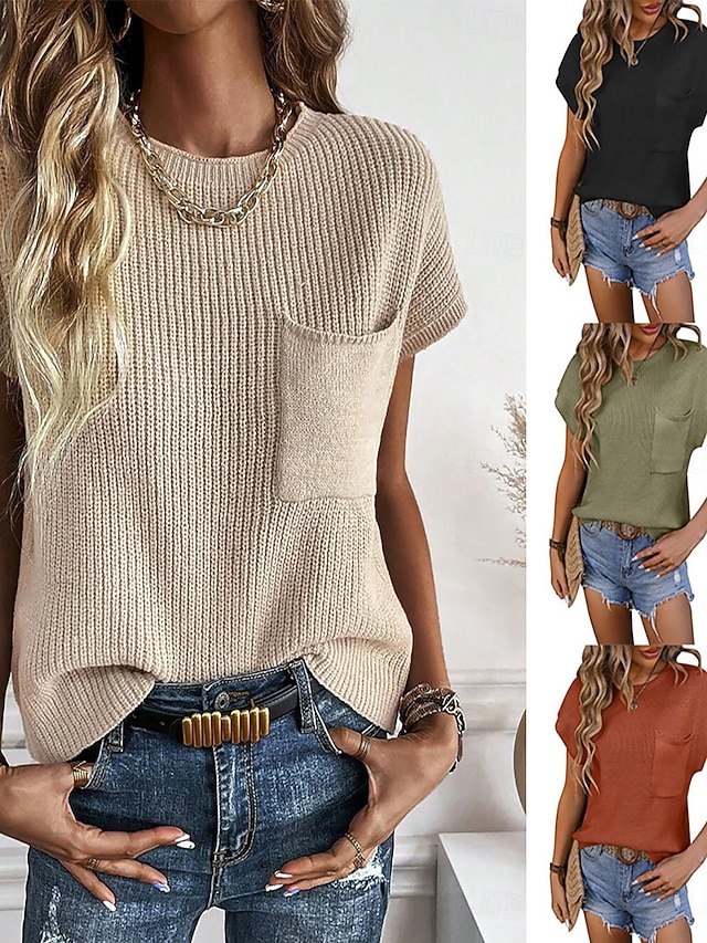 Naisten Neulos Pusero Tyylikäs Muoti Katutyyli Yhtenäinen väri Tiukka pyöreä kaula-aukko Kudottu Lyhyt hiha Tavalliset topit Neuloa Päivittäin ulko- Viikonloppu Punainen Ruskea Musta Kesä Kevät #19939962