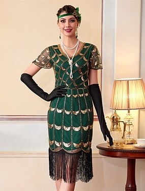 Möly 20s 1920-luku Polvipituinen Mekot Mekko Asut Lyhyet hihat Suuri Gatsby Häävieras Paljetti Tupsu V kaula-aukko Naamiaispuku Naisten Joulu Karnevaali Naamiaiset Iltajuhlat Naamiaiset Juhlat