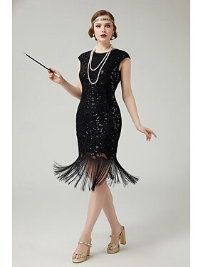 Vintage Möly 20s 1920-luku Polvipituinen Mekot Mekko Suuri Gatsby charleston Paljetti Tuubi V kaula-aukko Naamiaispuku Naisten Halloween Karnevaali Cocktailjuhla Aikuiset Aikuisten Leninki Kaikki