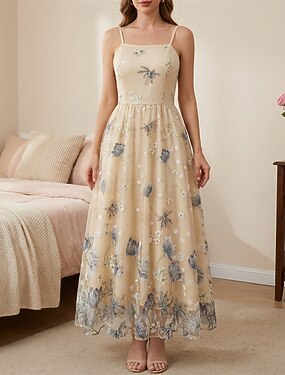 Tyylikäs 1950-luku Keskipäivä Mekot Spagettiolkaimet Kirjailtu Kukka A-linja Nelikulmainen kaula-aukko Naamiaispuku Naisten Ystävänpäivä Kausaliteetti Arkikäyttö Teekutsut Aikuiset Leninki Kesä