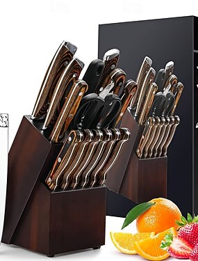 Kokin itseteroittuva ruostumattomasta teräksestä valmistettu vasaralla taottu veitsitelinesarja puisella pidikkeellä (15/16/20 osaa), mukaan lukien pihviveitsi, ihanteellinen värikäs lahjaidea
