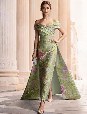 A-linja Kokopitkä Häävieraspuku Kukka mekko Iltapuku Tyylikäs Vintage Kukka-aihe Lyhythihainen Venekaula-aukko Puutarhajuhlat Häät Tasku Jakardi kanssa Kukkapainatus Laskokset