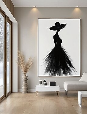 öljymaalaus 100% suurikokoinen käsintehty minimalistinen nainen mustassa mekossa ja hatussa, käsintehty kankaalle maalattu elegantti muotitaide tyylikkääseen kotiin, seinätaide, täydellinen lahja