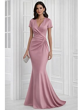 Trumpetti merenneito Hipaisulaahus Iltapuku Muodollinen mekko Tyylikäs Lyhythihainen V kaula-aukko Häät Muodollinen Pinkki mekko Satiini kanssa Rypytetty