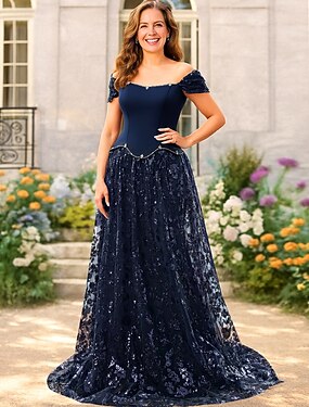 A-linja lattia-pituus prom-mekko juhlamekko cocktail-mekko morsiamen äidin mekko olkaimeton lyhyt hiha hartiat paljaana tyylikäs vintage ylellinen muodollinen ilta pitsillä kirjailulla värillä