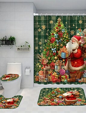 Neljäosainen suihkuverhoyhdistelmä, jossa liukumaton tukeva wc-istuin ja kylpyhuoneen lattiamatto, jouluinen joulupukkikuvio, joulukuusikuvio, vedenpitävä polyesterimateriaali, 12 koukkua