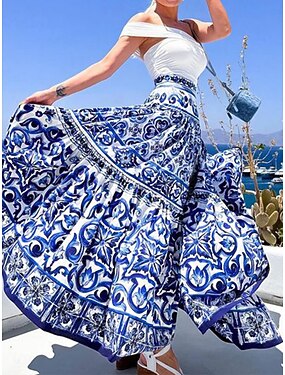 Naisten Etninen Vapaa-aika Boheemi Maxi Korka vyötärö Hameet Kukka Kuvitettu Painettu Elastinen Päivittäin Katu Sininen Kesä Polyesteri