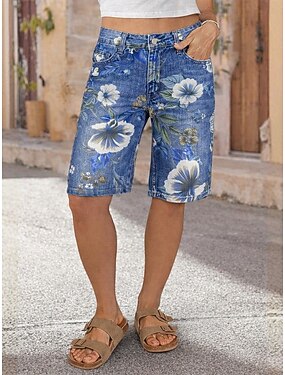 Naisten Bermudan shortsit Farkut Shortsit Kesähousut Loma Muoti Katutyyli Polven pituus Korka vyötärö Kukka Tasku Mukavuus Hengitettävyys Mukava Joustamaton Päivittäin Loma Katu Sininen Kesä Kevät