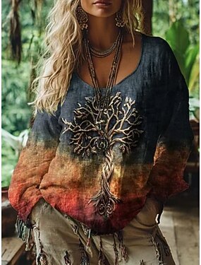 Naisten Boho paita Pusero Painettu Kukka Vintage Päivittäin Vapaa-aika Pitkähihainen V kaula-aukko Tavalliset topit Päivittäin Pyhäpäivä Sininen Keltainen Rubiini Purppura Fuksia Kesä Kevät Syksy