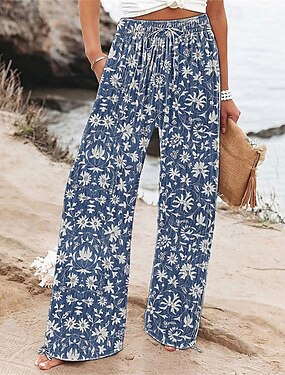Naisten Leveä reisi Housut Palazzo housut Vapaa-aika Boheemi Täyspitkä Korka vyötärö Kukka Kurenauha Joustava vyötärö Painettu Hengitettävyys Mukava Katu Arki-asut Bile Sininen Kevät Syksy Normaali