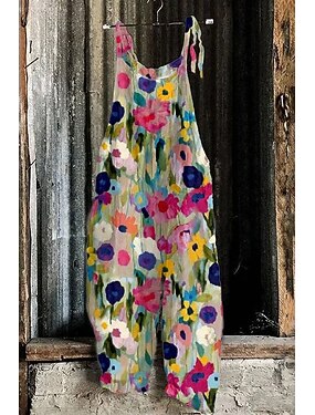 Naisten 100% puuvillaiset haalarit aktiiviseen käyttöön kukkakuosilla ilman hihoja suorat lahkeet neliön muotoinen kaula-aukko tasku lomamatka päivittäinen löysä istuvuus punainen sininen vihreä kesä