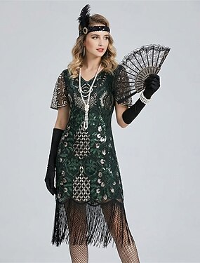 Vintage Möly 20s 1920-luku Polvipituinen Mekko Käsineet Päähine Hihaton Suuri Gatsby charleston Paljetti Tupsu Naamiaispuku Naisten Halloween Karnevaali Cocktailjuhla Aikuisten 1 Viuhka Leninki