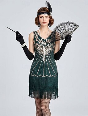 Vintage Möly 20s 1920-luku Polvipituinen Mekko Käsineet Päähine Hihaton Suuri Gatsby charleston Paljetti Tupsu Naamiaispuku Naisten Halloween Karnevaali Cocktailjuhla Aikuisten Leninki Päähine