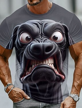 Miesten 3D-kuvioinen vihainen musta koiran naama murisee hyperresponsiivinen hauska eläin humoristinen kauttaaltaan printtipaita graafinen pyöreä kaula-aukko normaali istuvuus katutyyli rento