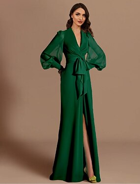 Ranta häät mermittiyöhame Tyylikäs mekko viralliseen häät vieraalle vyöhyke harja hame pitkät hihat V-aukko syksyn häät vieraalle sifonki halkiolla Strappy