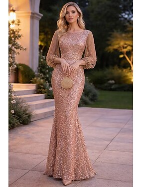 Viittamallinen iltapuku Elegant Sparkle Shine Petite Jewel Neck Lattia Pituus Paljetti 3/4 Pituus Hiha joka tekee vaikutuksen