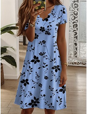 Naisten Mini mekko Tpaitamekko A linjainen mekko Loma Vapaa-aika Päivittäin Normaali Kukka Kuvitettu Lyhythihainen V kaula-aukko Sininen Punastuvan vaaleanpunainen Apila Tumman sininen Kesä Kevät