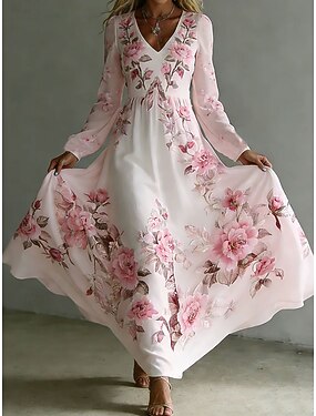 Naisten Maksimekko Laskostettu mekko Fit And Flare Mekko Syntymäpäivä Vapaa-aika Juhla Hiekkaranta Deitti Normaali Kukka Kuvitettu Pitkähihainen V kaula-aukko Punastuvan vaaleanpunainen Kesä Kevät