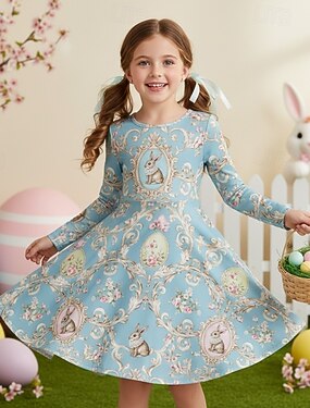 Pääsiäinen Tyttöjen 3D Kuvitettu Eläin Kani Mekko Pitkähihainen 3D-tulostus Kevät Syksy Päivittäin Loma Juhla Vapaa-aika Prinsessa Kaunis Lapset 4-12 vuotta Rento mekko A linjainen mekko Polvipituinen