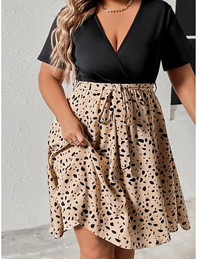 Naisten Pluskoko Rento mekko Leopardi V kaula-aukko Lyhythihainen Kevät Syksy Tyylikäs Muoti Moderni Vapaa-aika Minimekko Päivittäin Pyhäpäivä Mekko
